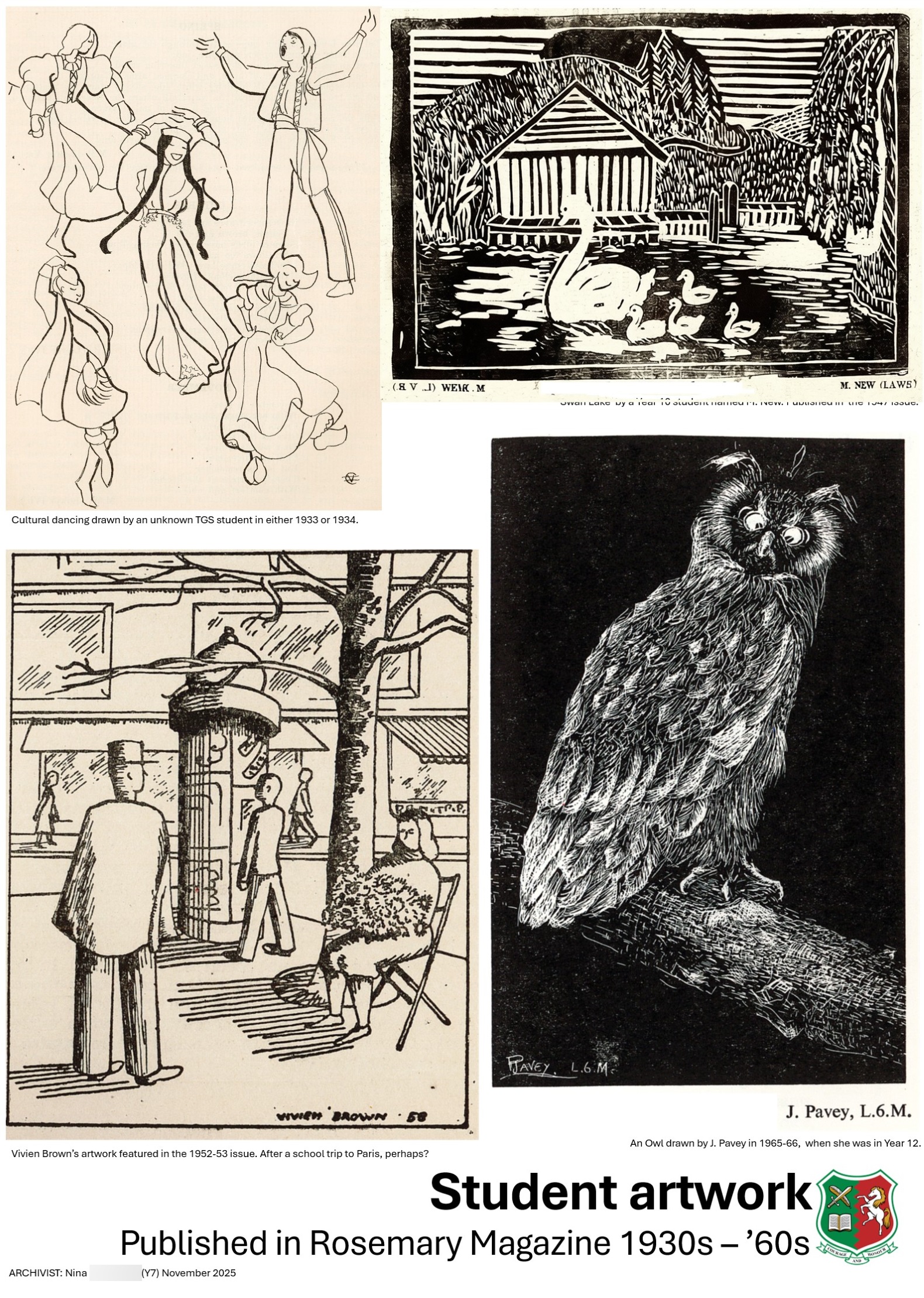 "I felt really excited about looking through the TGS School Archives because I feel really fascinated about looking through history and finding out about people who lived in the past whether that would be general history or the school’s history, it all fascinates me. I looked through the archive and found lots of drawings and paintings by students were included in the yearly school magazine which were published for many years from the 1930’s to 2000’s. I then picked my favourite from each decade so in the end I had student paintings from the 1930’s all the way up to the 2000’s. I also completed a poster about what the TGS houses were called back in the early 20th century and decided that it would be interesting to have them on a poster as well. I felt very happy to be contributing to the school’s history and uncovering the past for other people to learn about, especially as I also learnt things along the way too".